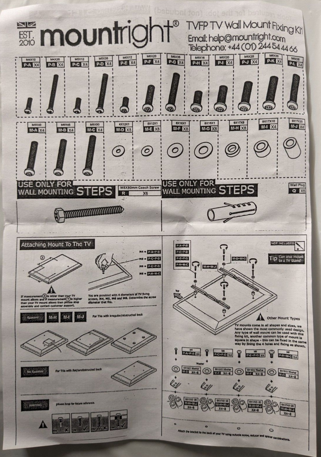 • All fixings are labelled, making it easier to find the correct size bolts required for the TV.
