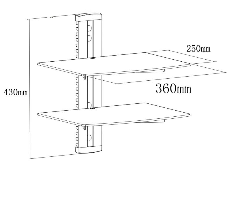 Product in brief:- A value two shelf wall mounted support for audio and visual equipment, black glass with black metal wall support which incorporates a cable management system to hide the cables from equipment to TV or monitor. The shelf sits perfectly under any wall mounted TV using a Umount wall bracket.