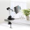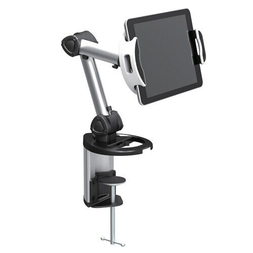 The universal tablet desk clamp holder is a solution to clamp your device on the desk. By mounting your iPad up and out of the way, you are protecting it from potential harms, such as heavy books being placed on it or spilt water.